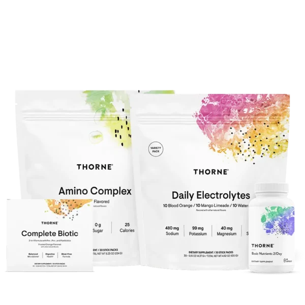 Thorne’s GLP-1 Support Stack includes a 30-day supply of four carefully selected nutritional supplements to support individuals engaged in weight-loss programs – those taking GLP-1s in particular.