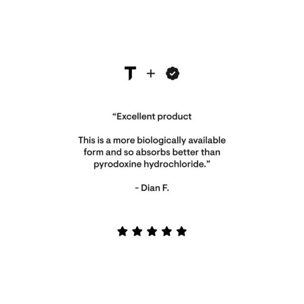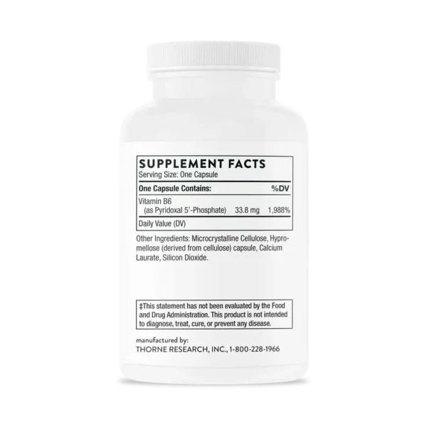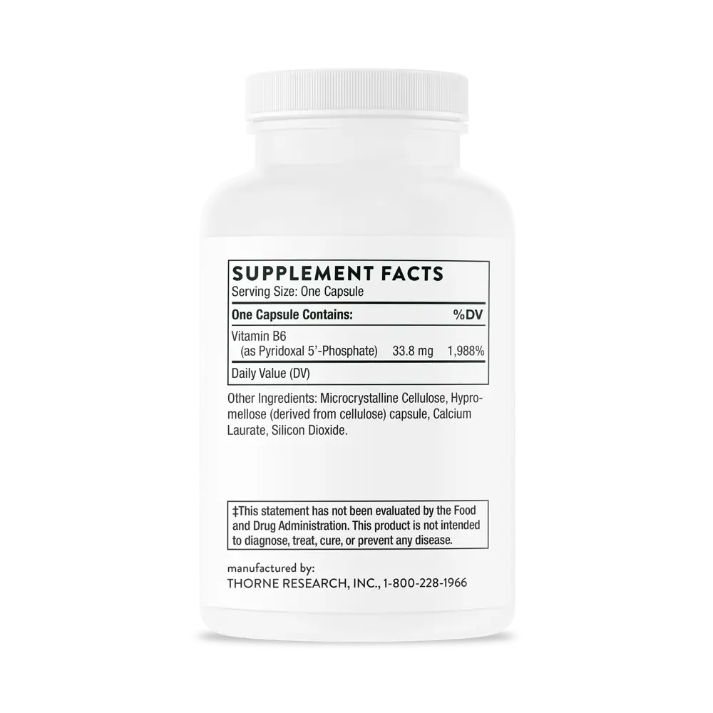 For vitamin B6 – also known as pyridoxine – to be used by the body, pyridoxine must be converted to pyridoxal 5′-phosphate (P5P).* Some individuals who have compromised liver function have difficulty converting pyridoxine to P5P, and therefore they can be at risk of a vitamin B6 deficiency.* Supplementing with Thorne’s Pyridoxal 5′-Phosphate ensures the most bioactive form of vitamin B6 is being supplemented.* This product is not derived from yeast.