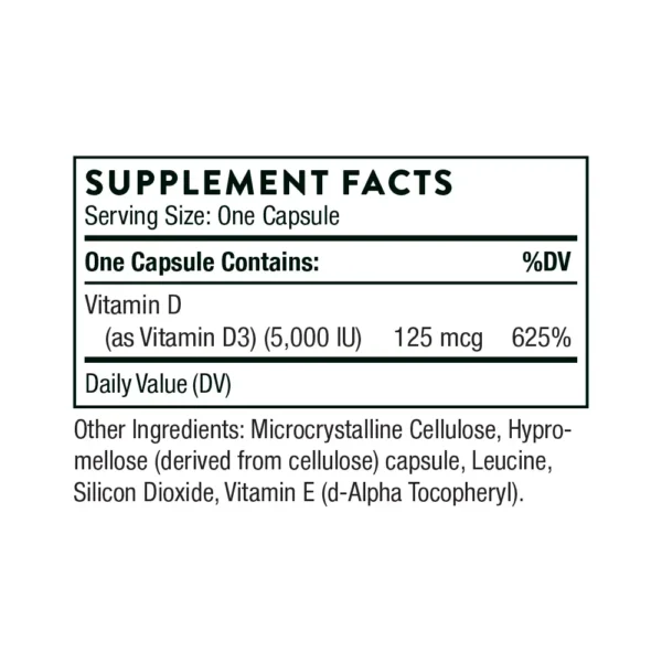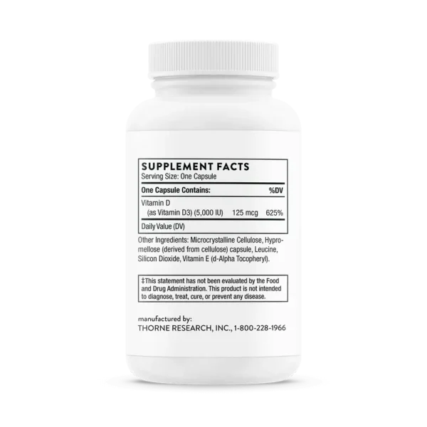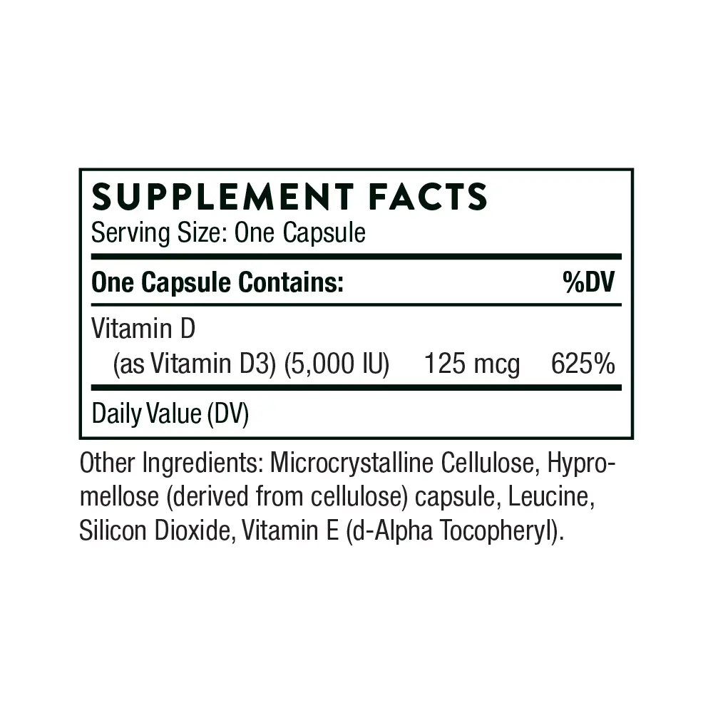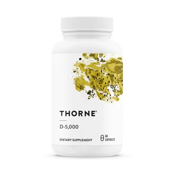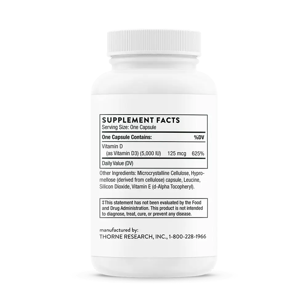 Thorne’s D-5,000 contains 5,000 IU of high-quality vitamin D3 and is NSF Certified for Sport®. Although it is well known that direct sunlight is a natural source of vitamin D, many individuals, especially the elderly, don’t get enough vitamin D from sunlight or from their diet. Be sure you get the vitamin D your body needs with Thorne’s easily absorbed Vitamin D-5,000.   Benefits of Thorne Vitamin D-5,000